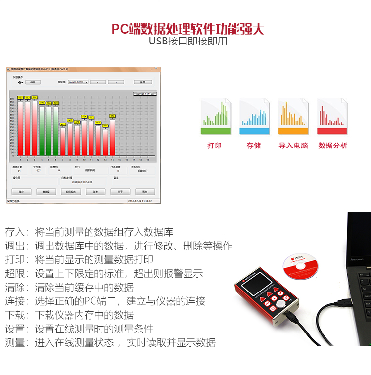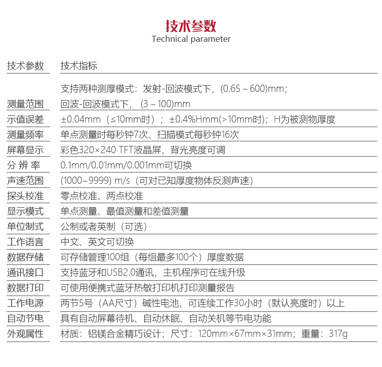 可存儲管理100組(每組最多100個)厚度數(shù)據(jù),支持藍(lán)牙和USB2.0通訊,主機(jī)程序可在線升級