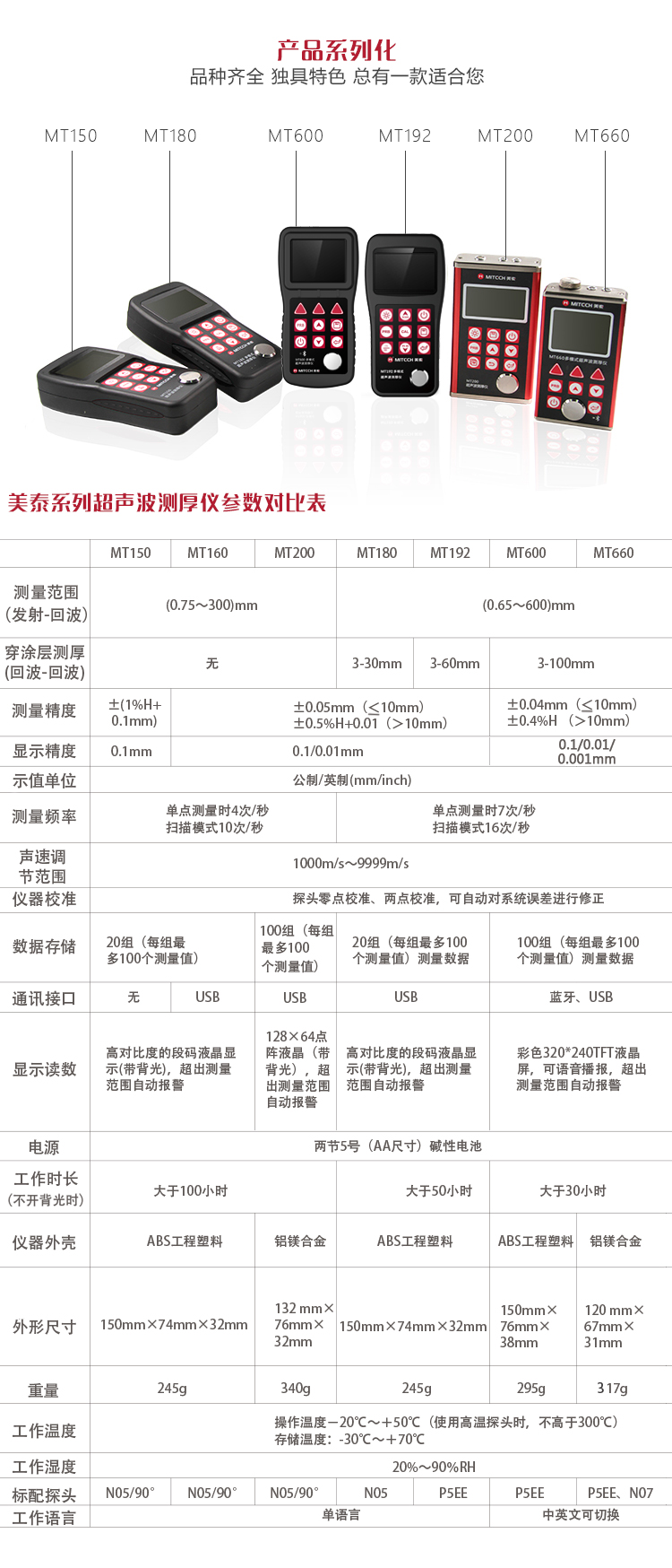 | 美泰系列超聲波測厚儀,均采用低功耗設(shè)計(jì)理念,超長待機(jī),MT150/MT160/MT200/MT180/MT192/MT280/MT600/MT660均由兩節(jié)AA五號電池供電、更換方便。 | |