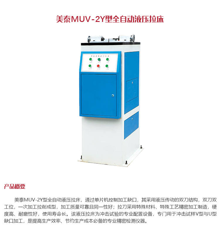 美泰MUV-2Y型全自動液壓拉床,通過單片機(jī)控制加工缺口,其采用液壓傳動的雙刀結(jié)構(gòu),雙刀雙工位,一次加工拉削成型,加工質(zhì)量可靠且同一性好;拉刀采用特殊材料、特殊工藝精密加工制造,硬度高、耐磨性好,使用壽命長。該液壓拉床為沖擊試驗(yàn)的專業(yè)配置設(shè)備,專門用于沖擊試樣V型與U型缺口加工,是提高生產(chǎn)效率、節(jié)約生產(chǎn)成本必備的專業(yè)精密檢測儀器。