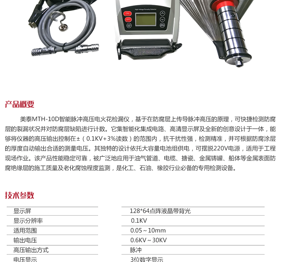 產(chǎn)品概述MTH-10D型數(shù)字式直流電火花檢漏儀,基于將脈沖高壓傳導(dǎo)通過防腐層的原理,可快捷檢測防腐層的裂漏狀況,使用中,針對防腐層的質(zhì)量問題,如遇針孔、氣泡、裂紋,儀器會發(fā)出明亮的電火花,同時伴有警示音,操作極為簡便,其獨(dú)特的設(shè)計(jì)依托大容量電池組供電,可擺脫220V電源,適用于工程現(xiàn)場作業(yè)。該產(chǎn)品性能穩(wěn)定可靠,被廣泛地應(yīng)用于油氣管道、電纜、搪瓷、金屬鑄罐、船體等金屬表面防腐絕緣層的施工質(zhì)量及老化腐蝕程度監(jiān)測,是化工、石油、橡膠行業(yè)必備的專用檢測設(shè)備。