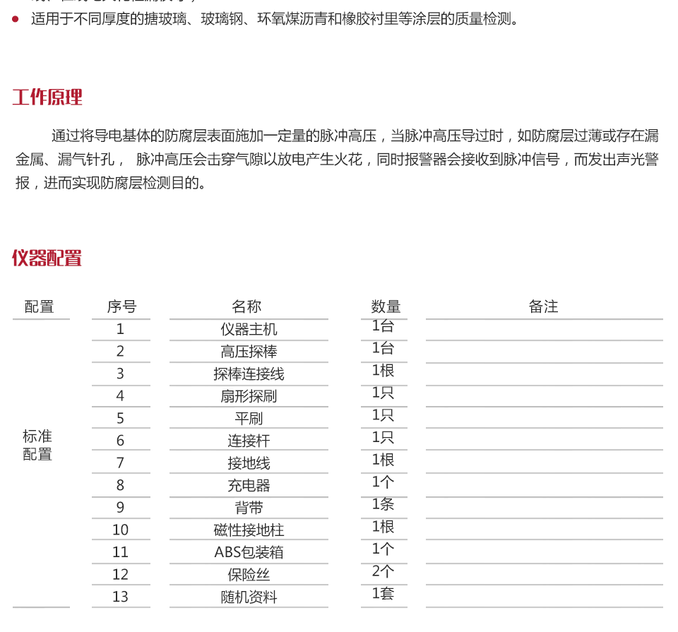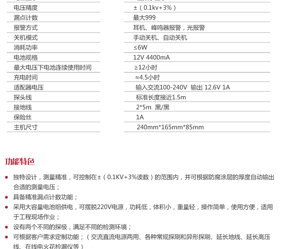 功能用途?適用于不同厚度的搪玻璃、玻璃鋼、環(huán)氧煤瀝青和橡膠襯里等涂層的質(zhì)量檢測。