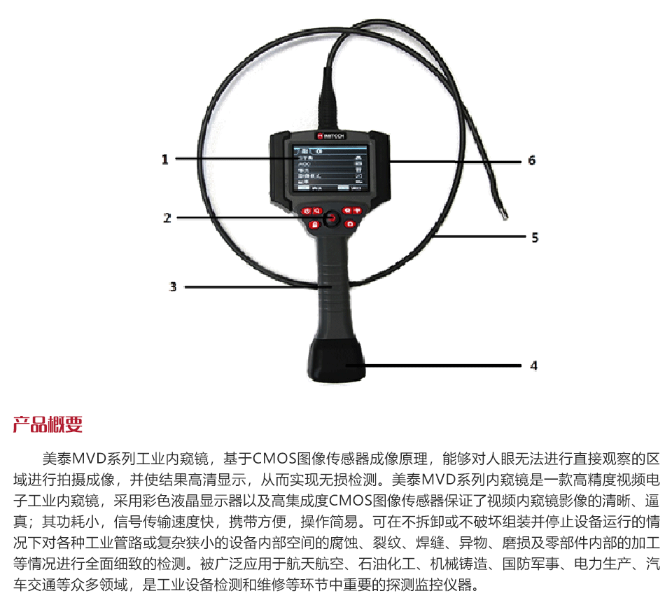 產(chǎn)品概述美泰MVD系列工業(yè)內(nèi)窺鏡,基于CMOS圖像傳感器成像原理,能夠?qū)θ搜蹮o(wú)法進(jìn)行直接觀察的區(qū)域進(jìn)行拍攝成像,高清顯示,從而實(shí)現(xiàn)無(wú)損檢測(cè)。美泰MVD系列內(nèi)窺鏡是一款高精度視頻電子工業(yè)內(nèi)窺鏡,采用彩色液晶顯示器以及高集成度CMOS圖像傳感器保證了視頻內(nèi)窺鏡影像的清晰、逼真;功耗小,信號(hào)傳輸速度快,攜帶方便,操作簡(jiǎn)易??稍诓徊鹦痘蚱茐慕M裝及停止設(shè)備運(yùn)行的情況下對(duì)各種工業(yè)管路或復(fù)雜狹小的設(shè)備內(nèi)部空間的腐蝕、裂紋、焊縫、異物、磨損及零部件內(nèi)部的加工等情況進(jìn)行全面細(xì)致的檢測(cè)。被廣泛應(yīng)用于航天航空、石油化工、機(jī)械鑄造、國(guó)防軍事、電力生產(chǎn)、汽車交通等眾多領(lǐng)域,是工業(yè)設(shè)備檢測(cè)和維修等環(huán)節(jié)中重要的探測(cè)監(jiān)控儀器。