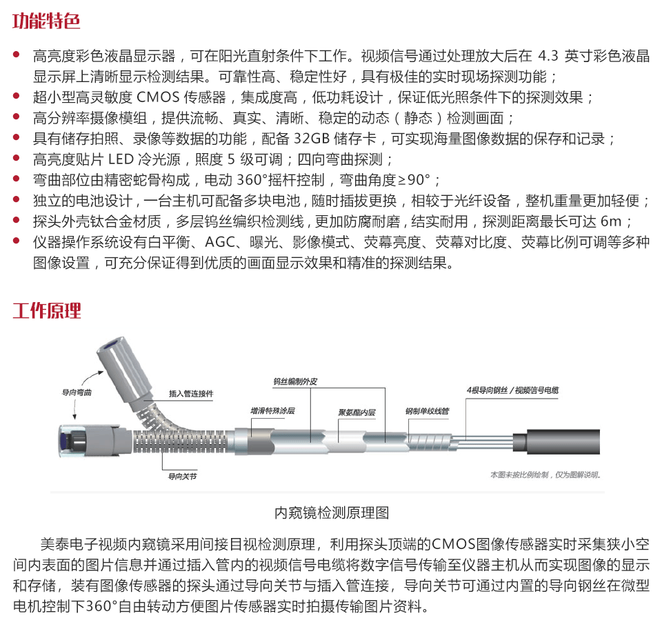 工作原理美泰電子視頻內(nèi)窺鏡采用間接目視檢測(cè)原理,利用探頭頂端的CMOS圖像傳感器實(shí)時(shí)采集狹小空間內(nèi)表面的圖片信息并通過(guò)插入管內(nèi)的視頻信號(hào)電纜將數(shù)字信號(hào)傳輸至儀器主機(jī)從而實(shí)現(xiàn)圖像的顯示和存儲(chǔ),裝有圖像傳感器的探頭通過(guò)導(dǎo)向關(guān)節(jié)與插入管連接,導(dǎo)向關(guān)節(jié)可通過(guò)內(nèi)置的導(dǎo)向鋼絲在微型電機(jī)控制下360°自由轉(zhuǎn)動(dòng)方便圖片傳感器實(shí)時(shí)拍攝傳輸圖片資料。