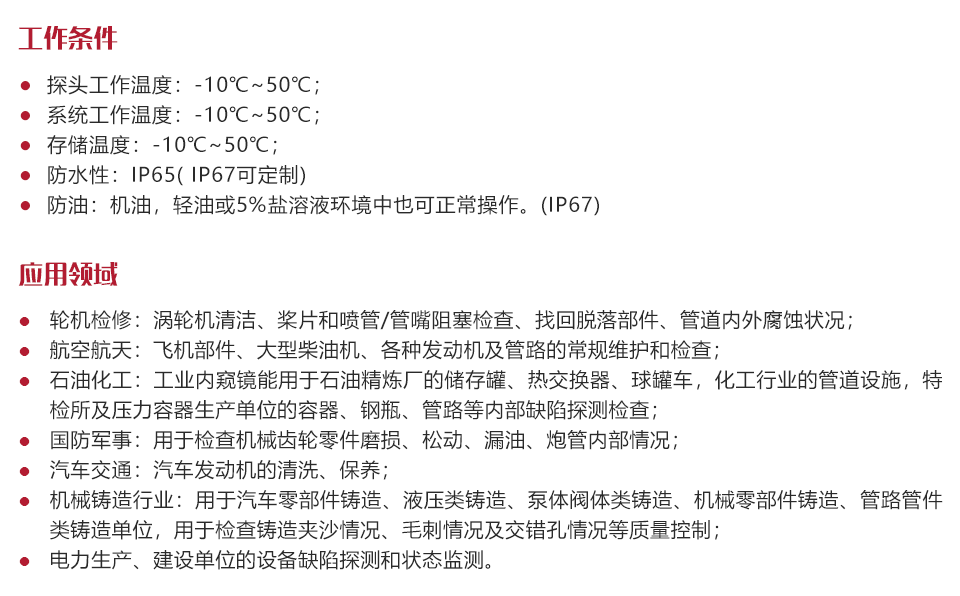 適用于狹小空間的視頻檢測(cè),可針對(duì)狹小空間、管路,發(fā)動(dòng)機(jī),零部件、液壓、氣動(dòng)件,鑄件內(nèi)部進(jìn)行檢測(cè)。 |
