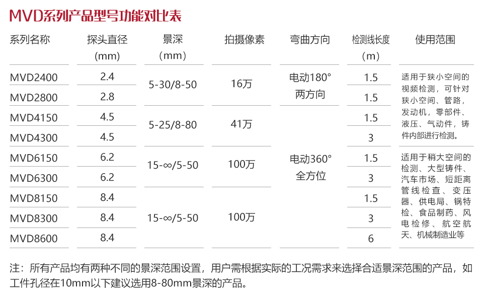 注:所有產(chǎn)品均有兩種不同的景深范圍設(shè)置,用戶需根據(jù)實(shí)際的工況需求來(lái)選擇合適景深范圍的產(chǎn)品,如工件孔徑在10mm以下建議選用8-80mm景深的產(chǎn)品 。