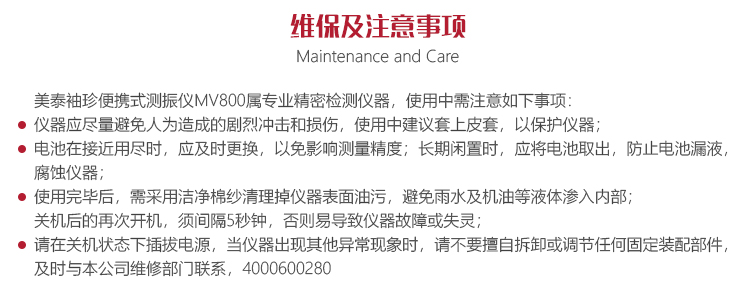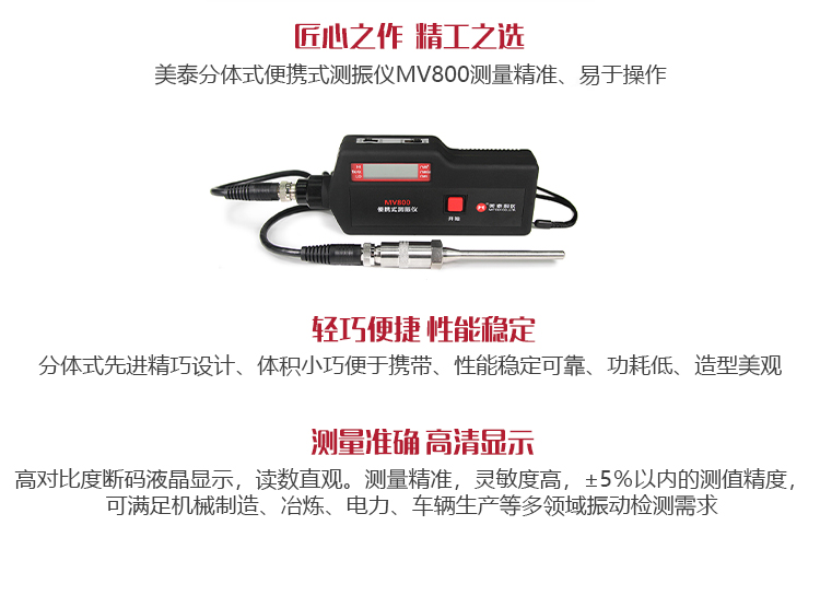 產(chǎn)品概述美泰便攜式測振儀MV800系列是由壓電式傳感器和數(shù)字顯示電路組成的手持式測振儀表,主要用于測量各種旋轉(zhuǎn)機(jī)械的振動加速度、速度和位移。MV800系列分兩種型號MV800-5(頻響范圍:5Hz~10KHz)和MV800-10(頻響范圍:10Hz~10KH),可滿足常規(guī)測振使用需求以及低頻振動測量需求。該產(chǎn)品測量范圍廣,顯示直觀、一體化的設(shè)計體積小、重量輕,測量攜帶方便,特別適用于野外無電源的現(xiàn)場作業(yè)及高空作業(yè),大大減少工作人員的工作強(qiáng)度,提高工作效率。