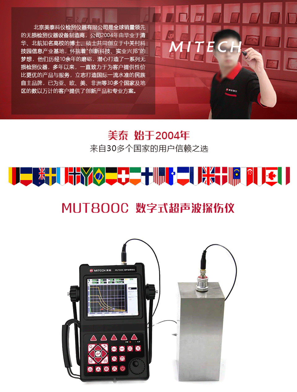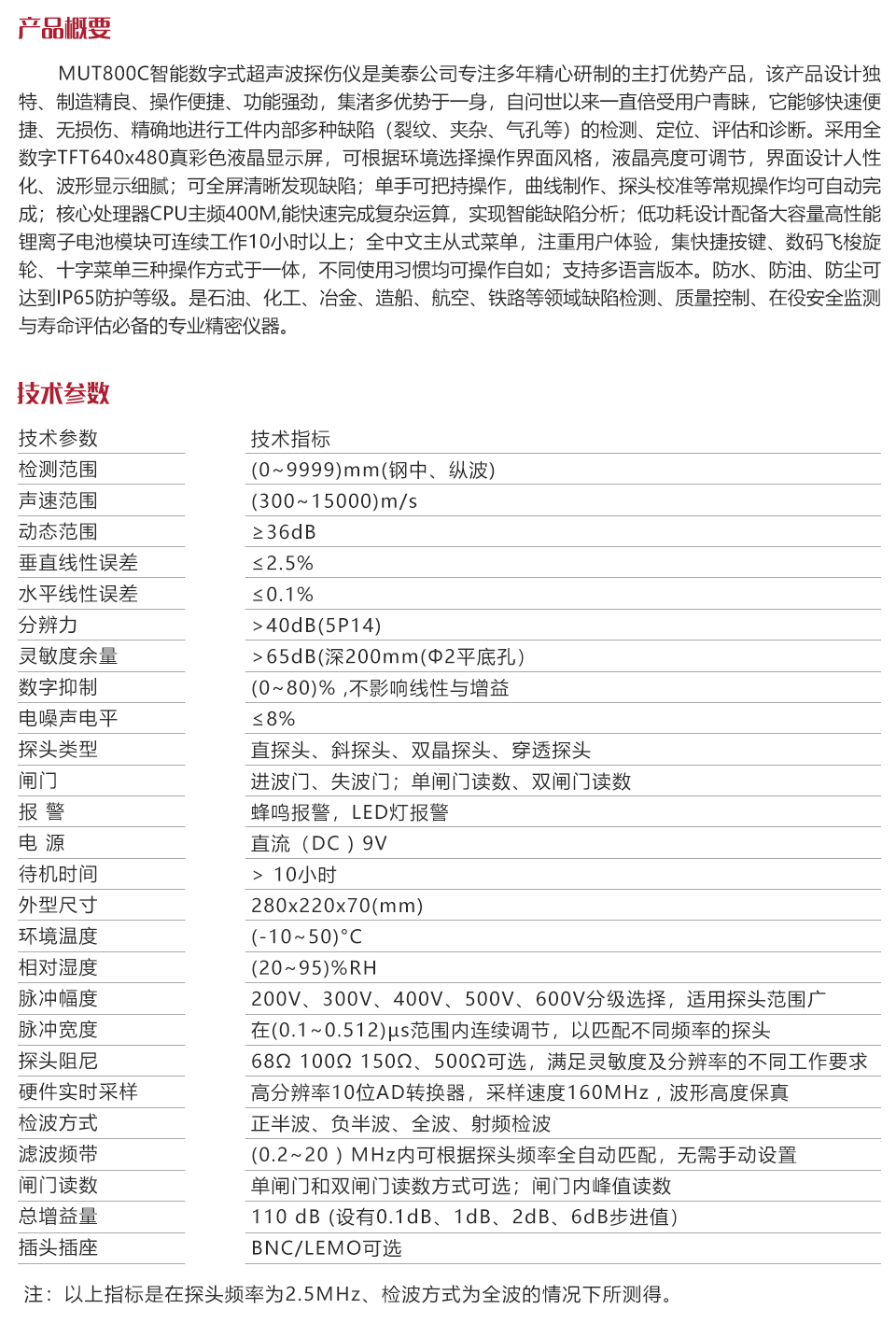 產(chǎn)品概述MUT800C智能數(shù)字式超聲波探傷儀是美泰公司專注多年精心研制的主打優(yōu)勢產(chǎn)品,該產(chǎn)品設(shè)計(jì)獨(dú)特、制造精良、操作便捷、功能強(qiáng)勁,集諸多優(yōu)勢于一身,自問世以來一直倍受用戶親睞,它能夠快速便捷、無損傷、精確地進(jìn)行工件內(nèi)部多種缺陷(裂紋、夾雜、氣孔等)的檢測、定位、評估和診斷。采用全數(shù)字TFT 640×480真彩色液晶顯示屏,可根據(jù)環(huán)境選擇操作界面風(fēng)格,液晶亮度可調(diào)節(jié),界面設(shè)計(jì)人性化、波形顯示細(xì)膩;可全屏清晰發(fā)現(xiàn)缺陷;單手可把持操作,曲線制作、探頭校準(zhǔn)等常規(guī)操作均可自動(dòng)完成;核心處理器CPU主頻400M,能快速完成復(fù)雜運(yùn)算,實(shí)現(xiàn)智能缺陷分析;低功耗設(shè)計(jì)配備大容量高性能鋰離子電池模塊可連續(xù)工作10小時(shí)以上;全中文主從式菜單,注重用戶體驗(yàn),集快捷按鍵、數(shù)碼飛梭旋輪、十字菜單三種操作方式于一體,不同使用習(xí)慣均可操作自如;支持多語言版本。防水、防油、防塵可達(dá)到IP65防護(hù)等級。是石油、化工、冶金、造船、航空、鐵路等領(lǐng)域缺陷檢測、質(zhì)量控制、在役安全監(jiān)測與壽命評估必備的專業(yè)精密儀器。