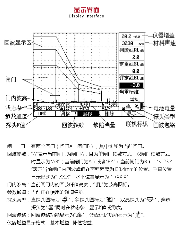 ?自動(dòng)關(guān)機(jī):當(dāng)電池電壓太低時(shí),屏幕上的電池圖標(biāo)會(huì)閃爍顯示,然后探傷儀會(huì)自動(dòng)關(guān)機(jī)斷電。