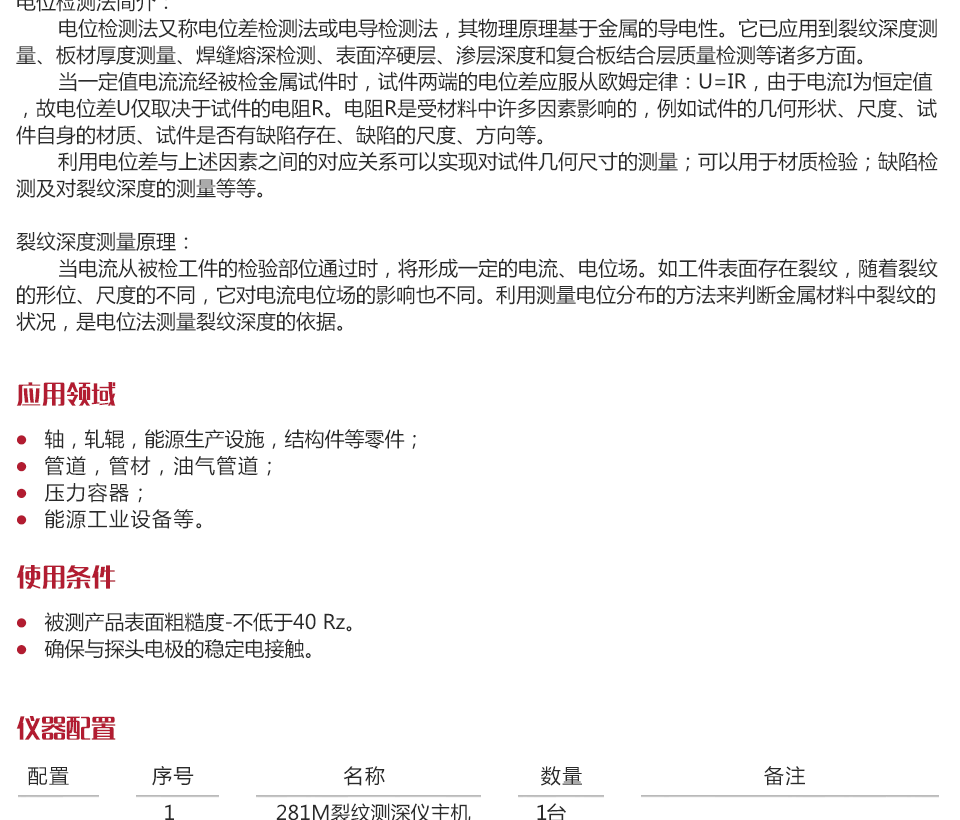 利用電位差與上述因素之間的對應關系可以實現(xiàn)對試件幾何尺寸的測量;可以用于材質(zhì)檢驗;缺陷檢測及對裂紋深度的測量等等。