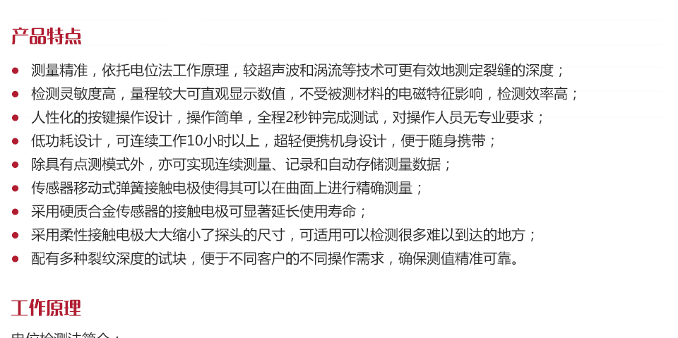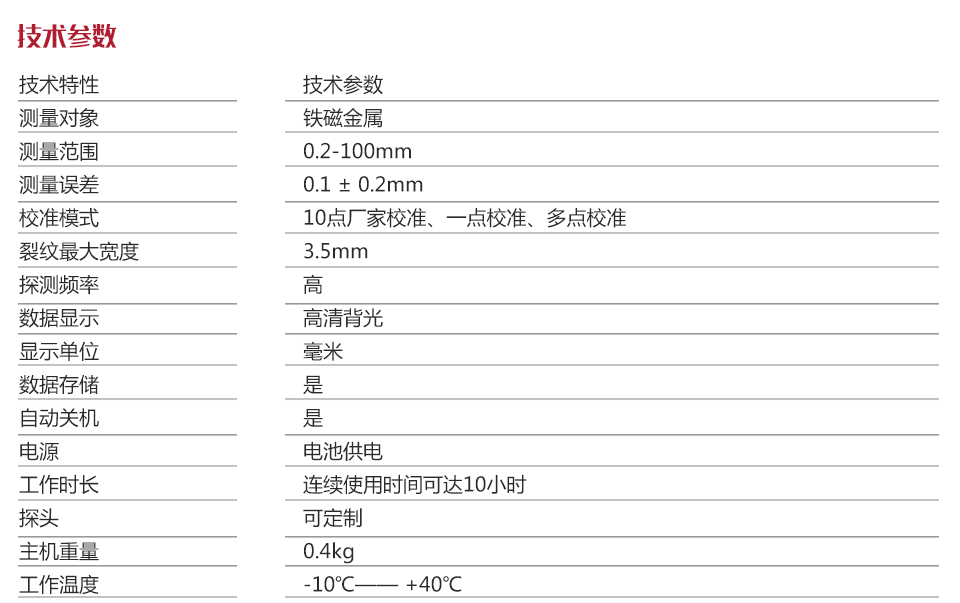 檢測靈敏度高,量程較大可直觀顯示數(shù)值,不受被測材料的電磁特征影響,檢測效率高;