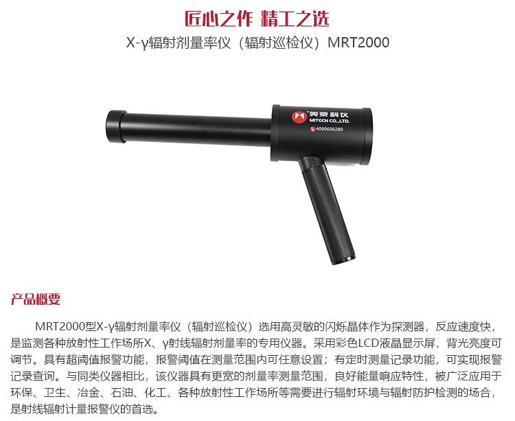 MRT2000型X-γ輻射劑量率儀(輻射巡檢儀) 選用高靈敏的閃爍晶體作為探測器,反應(yīng)速度快,是監(jiān)測各種放射性工作場所X、γ射線輻射劑量率的專用儀器。采用彩色LCD液晶顯示屏,背光亮度可調(diào)節(jié)。具有超閾值報警功能,報警閾值在測量范圍內(nèi)可任意設(shè)置;有定時測量記錄功能,可實(shí)現(xiàn)報警記錄查詢。與同類儀器相比,該儀器具有更寬的劑量率測量范圍,良好能量響應(yīng)特性,被廣泛應(yīng)用于環(huán)保、衛(wèi)生、冶金、石油、化工、各種放射性工作場所等需要進(jìn)行輻射環(huán)境與輻射防護(hù)檢測的場合,是射線輻射計量報警儀的首選。