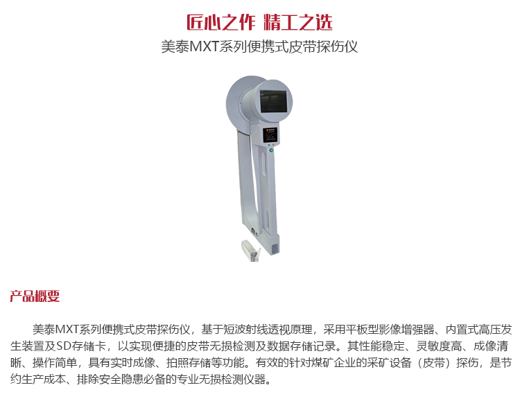 產(chǎn)品概述美泰MXT系列便攜式皮帶探傷儀,基于短波射線透視原理,采用平板型影像增強器、內置式高壓發(fā)生裝置及SD存儲卡,以實現(xiàn)便捷的皮帶無損檢測及數(shù)據(jù)存儲記錄。其性能穩(wěn)定、靈敏度高、成像清晰、操作簡單,具有實時成像、拍照存儲等功能。有效的針對煤礦企業(yè)的采礦設備(皮帶)探傷,是節(jié)約生產(chǎn)成本、排除安全隱患必備的專業(yè)無損檢測儀器。