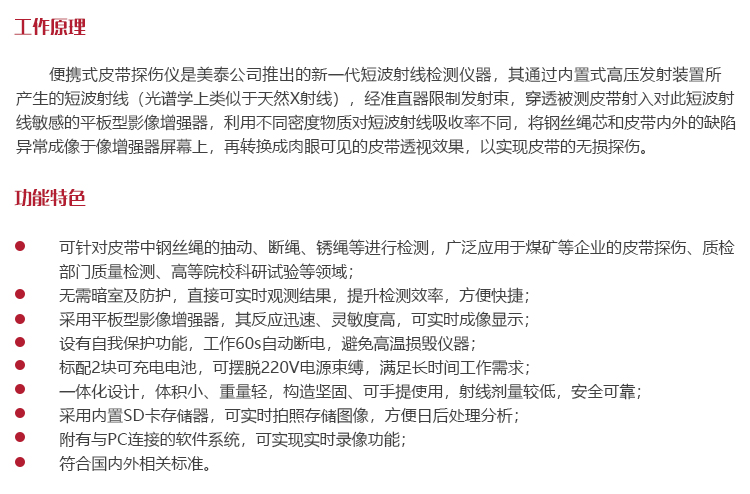 工作原理便攜式皮帶探傷儀是美泰公司推出的新一代短波射線檢測儀器,其通過內置式高壓發(fā)射裝置所產(chǎn)生的短波射線(光譜學上類似于天然X射線),經(jīng)準直器限制發(fā)射束,穿透被測皮帶射入對此短波射線敏感的平板型影像增強器,利用不同密度物質對短波射線吸收率不同,將鋼絲繩芯和皮帶內外的缺陷異常成像于像增強器屏幕上,再轉換成肉眼可見的皮帶透視效果,以實現(xiàn)皮帶的無損探傷。