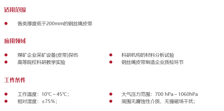 儀器特點可針對皮帶中鋼絲繩的抽動、斷繩、銹繩等進行檢測,廣泛應用于煤礦等企業(yè)的皮帶探傷、質檢部門質量檢測、高等院校科研試驗等領域;