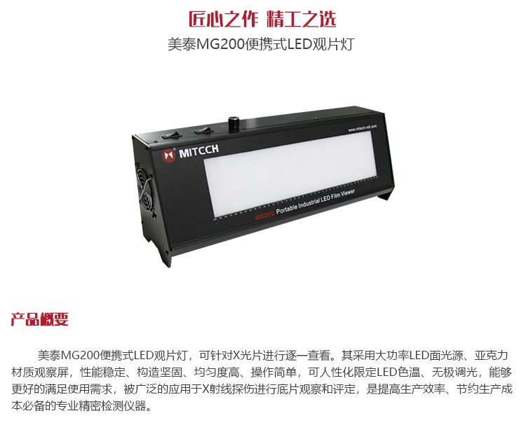 產(chǎn)品概述美泰MG200便攜式LED觀片燈,可針對(duì)X光片進(jìn)行逐一查看。其采用大功率LED面光源、亞克力材質(zhì)觀察屏,性能穩(wěn)定、構(gòu)造堅(jiān)固、均勻度高、操作簡(jiǎn)單,可人性化限定LED色溫、無(wú)極調(diào)光,能夠更好的滿足使用需求,被廣泛的應(yīng)用于X射線探傷進(jìn)行底片觀察和評(píng)定,是提高生產(chǎn)效率、節(jié)約生產(chǎn)成本必備的專(zhuān)業(yè)精密檢測(cè)儀器。