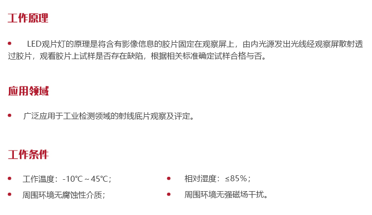 工作原理LED觀片燈的原理是將含有影像信息的膠片固定在觀察屏上,由內(nèi)光源發(fā)出光線經(jīng)觀察屏散射透過(guò)膠片,觀看膠片上試樣是否存在缺陷,根據(jù)相關(guān)標(biāo)準(zhǔn)確定試樣合格與否。
