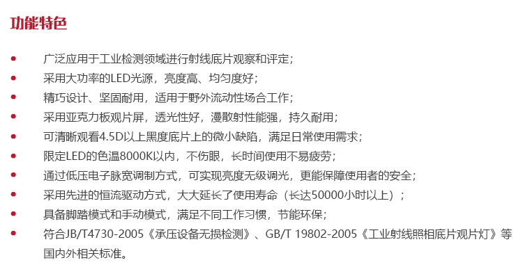 符合JB/T4730-2005《承壓設(shè)備無(wú)損檢測(cè)》、GB/T 19802-2005《工業(yè)射線照相底片觀片燈》等國(guó)內(nèi)外相關(guān)標(biāo)準(zhǔn)。