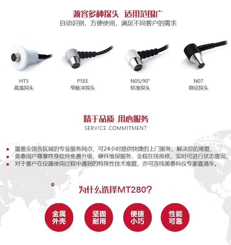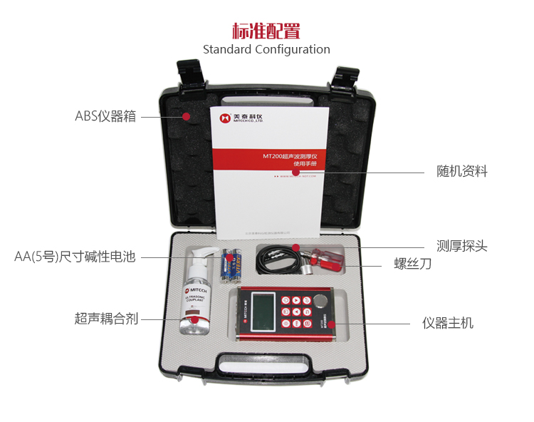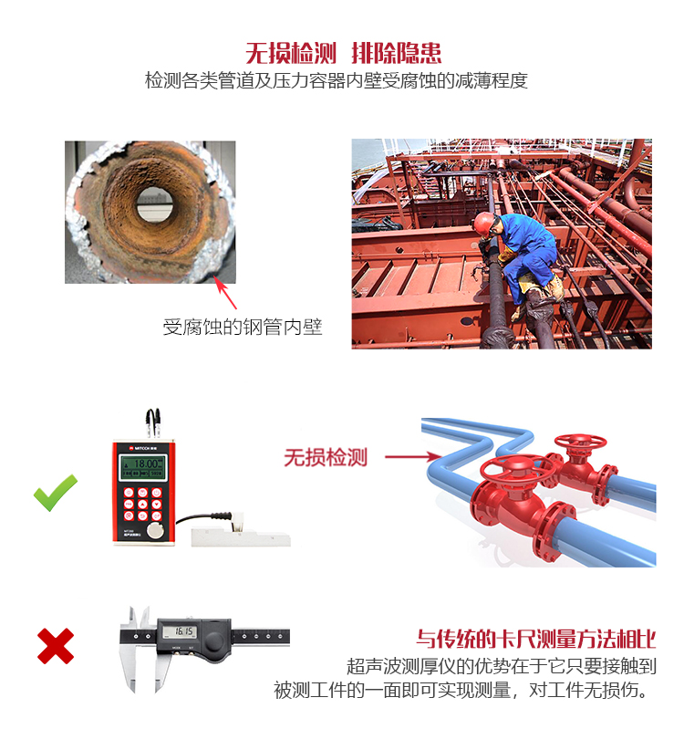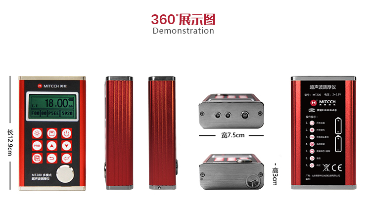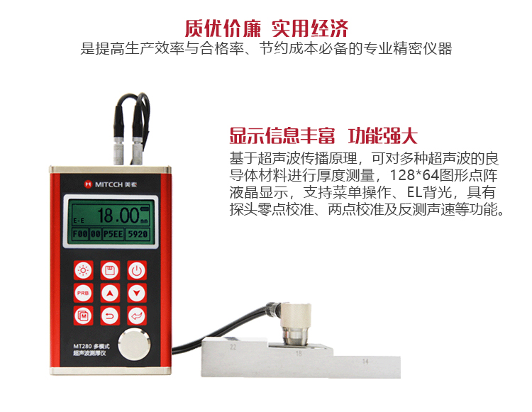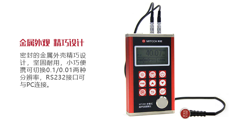 產品概述MT280超聲波測厚儀,基于超聲波測量原理,可對金屬、塑料、陶瓷、玻璃及其他多種超聲波的良導體材料進行厚度測量,也可實現(xiàn)對材料聲速的反測。密封的金屬外殼精巧設計,可防御惡劣現(xiàn)場環(huán)境中的油污、粉塵;與傳統(tǒng)的測量方法相比,超聲波測厚儀的優(yōu)勢在于它只要接觸到被測工件的一面即可完成測量,其獨特的無損檢測性能為封閉類管材、容器等厚度檢測受局限的工況提供了完美的解決方案。MT280兼?zhèn)浯┩竿繉幽J脚c普通模式雙效功能,測量前無需處理掉表面的涂層,可直接測量。被廣泛應用于石油、化工、冶金、造船、航空、航天等領域的生產設備中各種管道及壓力容器腐蝕減薄程度的監(jiān)測,也可用于對各種板材及各種加工零件做精確的測量。是提高生產效率與合格率、節(jié)約成本必備的專業(yè)精密儀器。