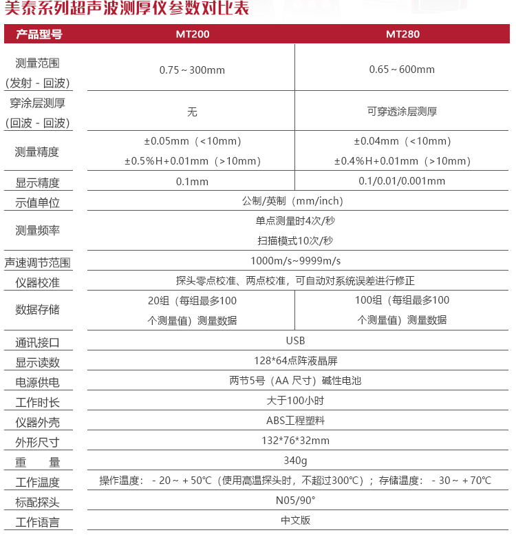 | 美泰系列超聲波測厚儀,均采用低功耗設計理念,超長待機,MT150/MT160/MT200/MT180/MT192/MT280/MT600/MT660均由兩節(jié)AA五號電池供電、更換方便。 | |