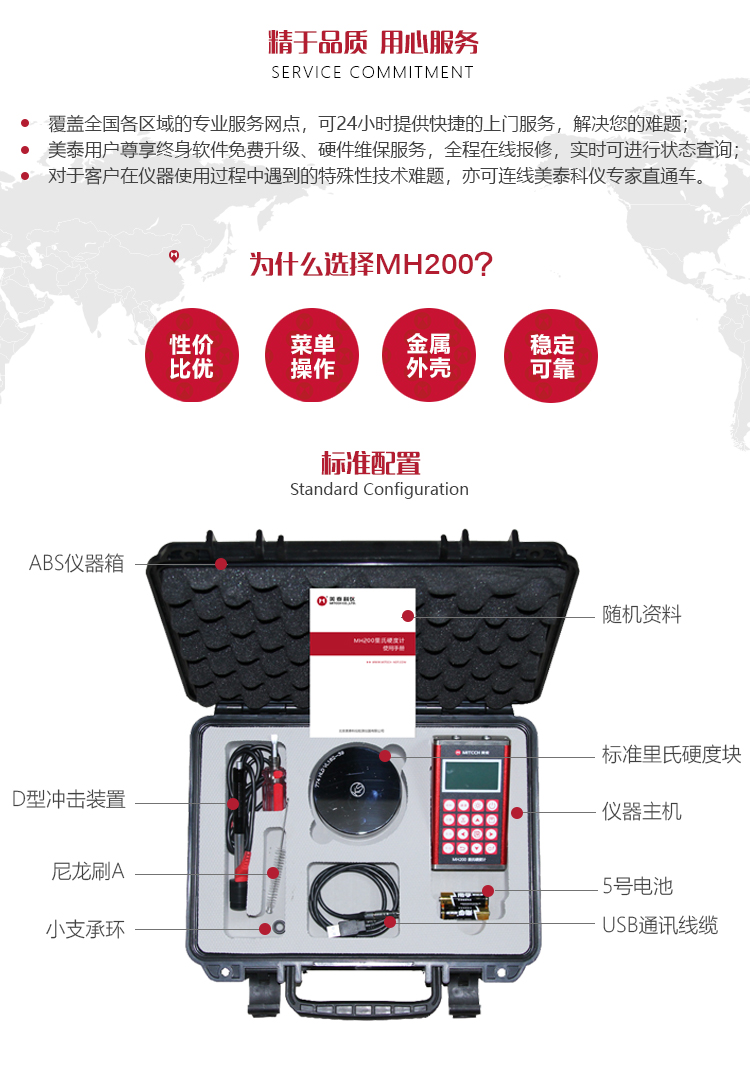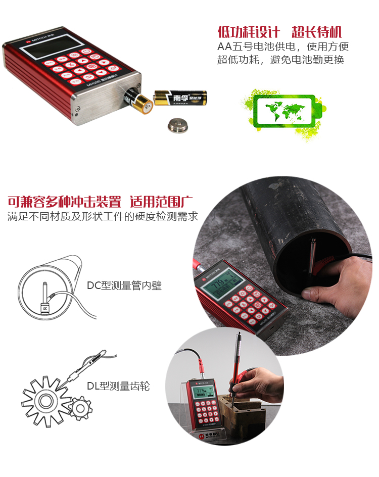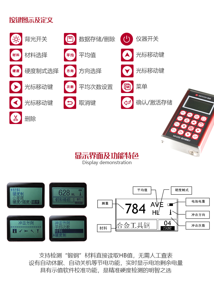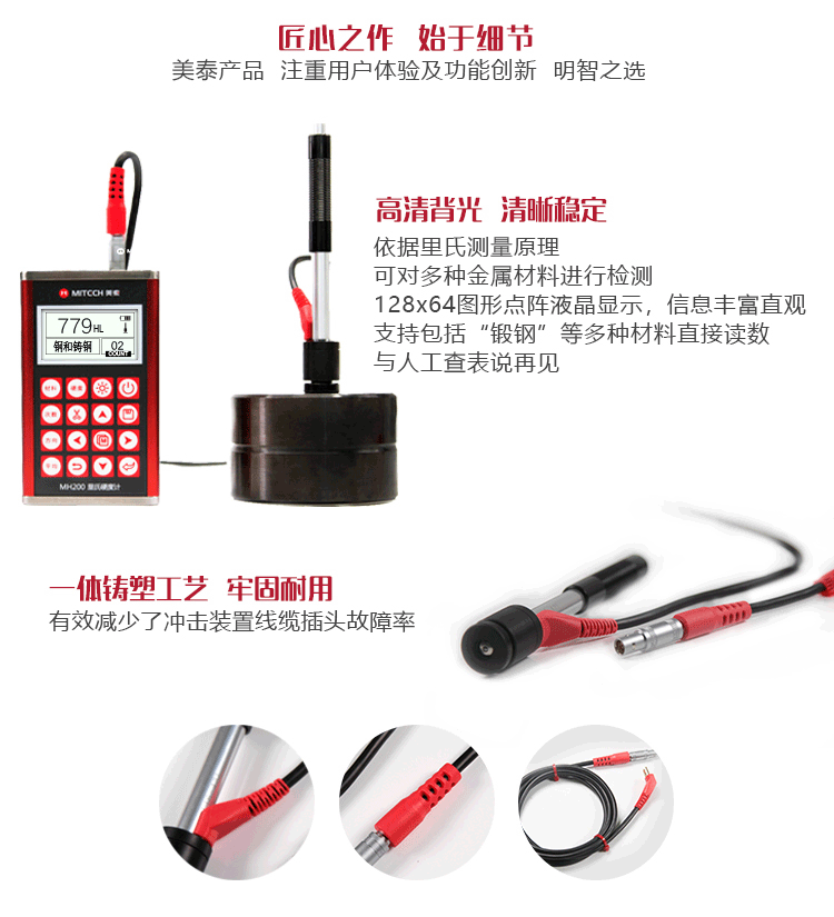產(chǎn)品概述MH200便攜式里氏硬度計(jì),基于里氏硬度測(cè)量原理,可方便快捷地現(xiàn)場(chǎng)檢測(cè)多種金屬材料的硬度,支持里氏、布氏、洛氏等多種硬度制氏間的自由轉(zhuǎn)換。它采用國(guó)際流行的全封閉鋁美合金外殼,堅(jiān)固耐用,擁有強(qiáng)大的抗電磁、抗振動(dòng)、抗干擾能力;低功耗設(shè)計(jì)依托穩(wěn)定的IC集成電路,性能可靠;全中文點(diǎn)陣液晶顯示,菜單式操作簡(jiǎn)單快捷;支持PC機(jī)通訊及打印功能。被廣泛應(yīng)用于退火、回火、淬火熱處理工件的質(zhì)量控制;機(jī)床導(dǎo)軌、汽車底盤(pán)的硬度檢測(cè);大型不可拆卸零部件的現(xiàn)場(chǎng)在役硬度測(cè)試;五金、鍛造、機(jī)床、特種鋼材的質(zhì)量檢測(cè);批量生產(chǎn)過(guò)程中產(chǎn)品的質(zhì)量控制等,質(zhì)優(yōu)價(jià)廉,實(shí)用經(jīng)濟(jì),是硬度檢測(cè)常規(guī)需求的明智之選。