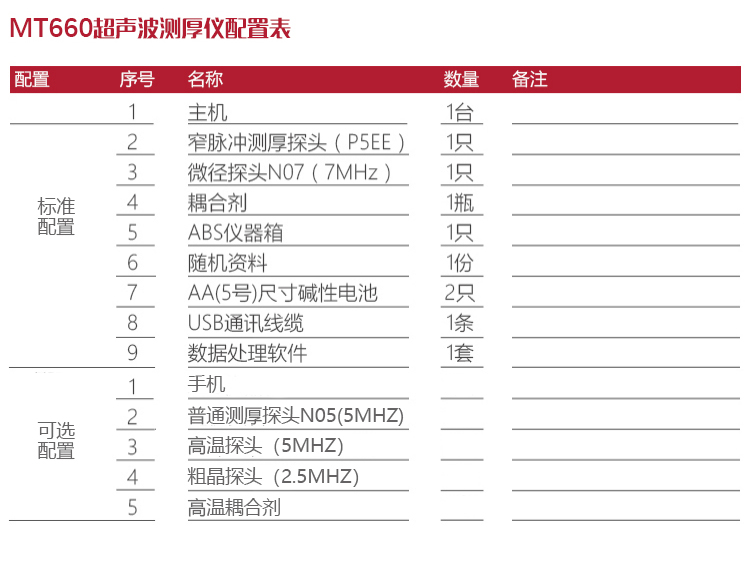 | 探頭直徑 | 測厚探頭NO5直徑10MM、微晶探頭N07直徑6MM、高溫探頭HT5直徑12MM、窄脈沖測厚探頭P5EE直徑10MM、粗晶探頭直徑12MM |